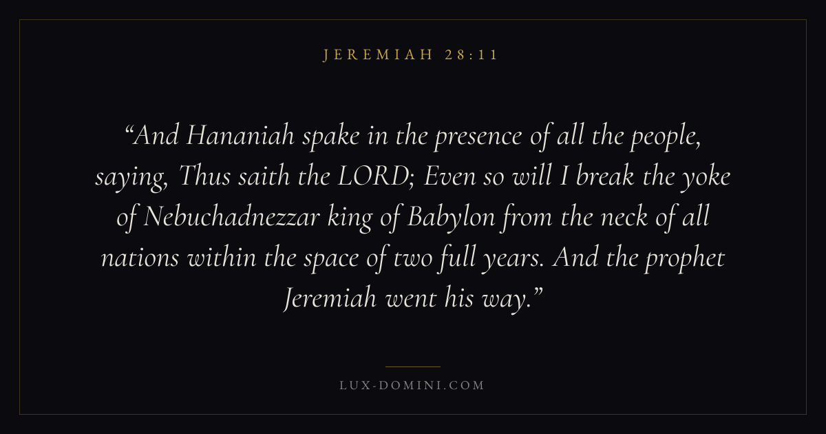 And Hananiah spake in the presence of all the people, saying, Thus saith the LORD; Even so will I break the yoke of Nebuchadnezzar king of Babylon from the neck of all nations within the space of two full years. And the prophet Jeremiah went his way.