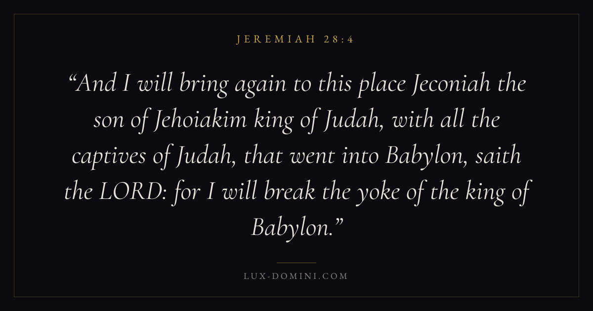 And I will bring again to this place Jeconiah the son of Jehoiakim king of Judah, with all the captives of Judah, that went into Babylon, saith the LORD: for I will break the yoke of the king of Babylon.