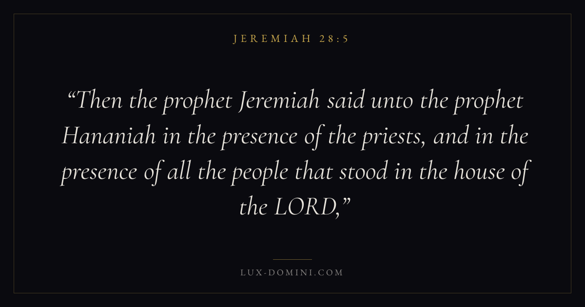 Then the prophet Jeremiah said unto the prophet Hananiah in the presence of the priests, and in the presence of all the people that stood in the house of the LORD,