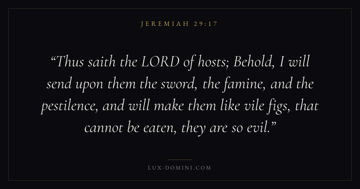 Thus saith the LORD of hosts; Behold, I will send upon them the sword, the famine, and the pestilence, and will make them like vile figs, that cannot be eaten, they are so evil.