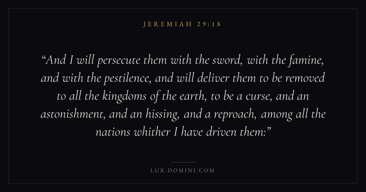 And I will persecute them with the sword, with the famine, and with the pestilence, and will deliver them to be removed to all the kingdoms of the earth, to be a curse, and an astonishment, and an hissing, and a reproach, among all the nations whither I have driven them: