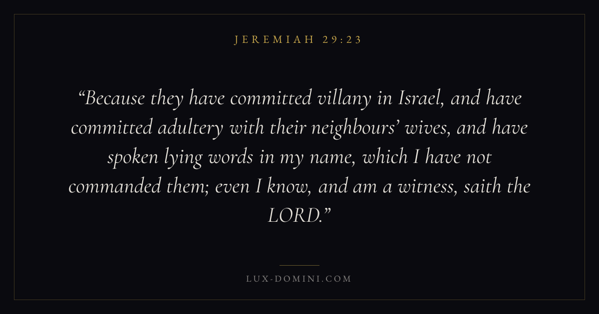 Because they have committed villany in Israel, and have committed adultery with their neighbours’ wives, and have spoken lying words in my name, which I have not commanded them; even I know, and am a witness, saith the LORD.