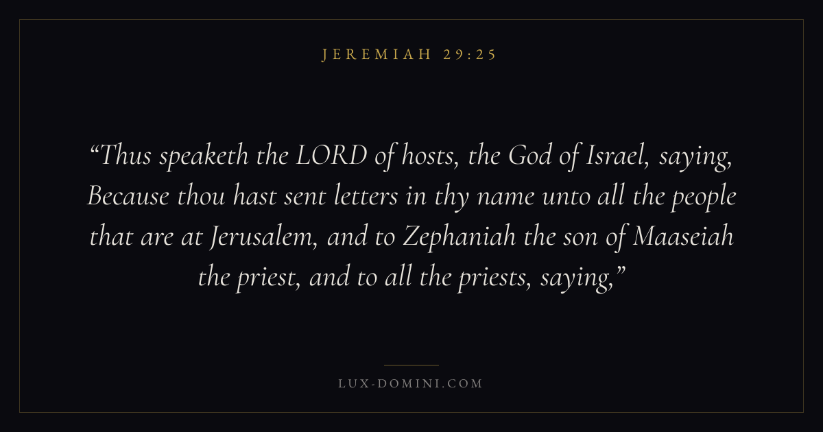 Thus speaketh the LORD of hosts, the God of Israel, saying, Because thou hast sent letters in thy name unto all the people that are at Jerusalem, and to Zephaniah the son of Maaseiah the priest, and to all the priests, saying,