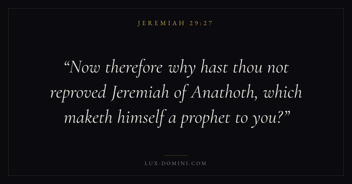 Now therefore why hast thou not reproved Jeremiah of Anathoth, which maketh himself a prophet to you?
