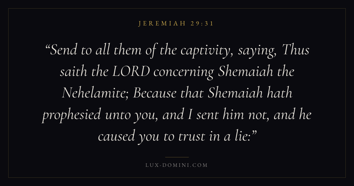 Send to all them of the captivity, saying, Thus saith the LORD concerning Shemaiah the Nehelamite; Because that Shemaiah hath prophesied unto you, and I sent him not, and he caused you to trust in a lie: