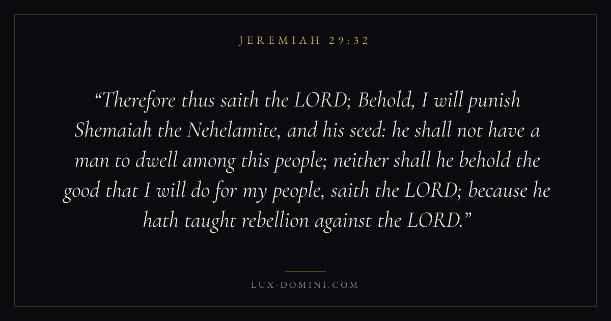 Therefore thus saith the LORD; Behold, I will punish Shemaiah the Nehelamite, and his seed: he shall not have a man to dwell among this people; neither shall he behold the good that I will do for my people, saith the LORD; because he hath taught rebellion against the LORD.