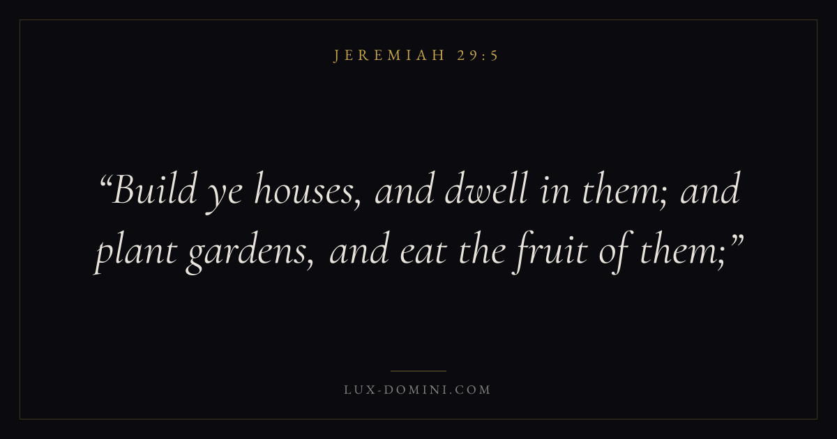 Books / Jeremiah / Chapter 29 / Verse 5 ← Jeremiah 29:4 Jeremiah 29:5 Jeremiah 29:6 → Build ye houses, and dwell in them; and plant gardens, and eat the fruit of them; Download verse card Share on Twitter Share on Facebook Pin it ✦ Key themes HopeSuffering and trialsJustice and mercyTruthJudgment Read with Jeremiah 29:1Jeremiah 29:2Romans 8:24Revelation 21:4 Related topics Bible verses about hopeBible verses about suffering and trialsBible verses about justice and mercyBible verses about truth ✦ Jeremiah Chapter 29 verses V. 1 V. 2 V. 3 V. 4 V. 5 V. 6 V. 7 V. 8 V. 9 V. 10 V. 11 V. 12 V. 13 V. 14 V. 15 V. 16 V. 17 V. 18 V. 19 V. 20 V. 21 V. 22 V. 23 V. 24 V. 25 V. 26 V. 27 V. 28 V. 29 V. 30 V. 31 V. 32