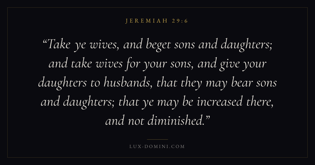 Take ye wives, and beget sons and daughters; and take wives for your sons, and give your daughters to husbands, that they may bear sons and daughters; that ye may be increased there, and not diminished.
