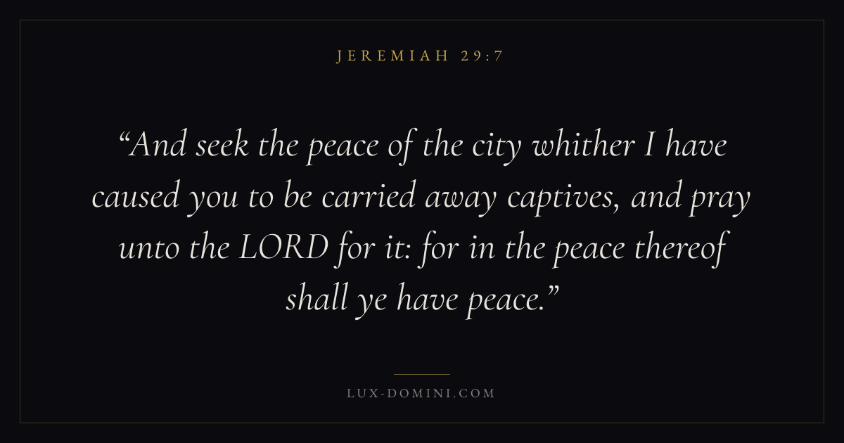 And seek the peace of the city whither I have caused you to be carried away captives, and pray unto the LORD for it: for in the peace thereof shall ye have peace.