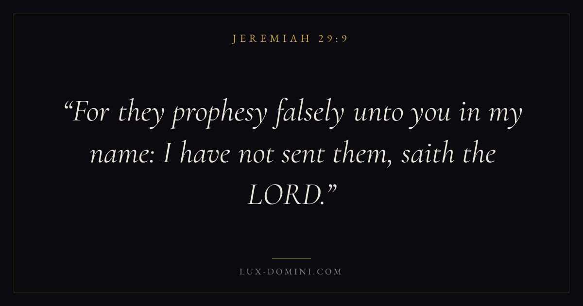 Books / Jeremiah / Chapter 29 / Verse 9 ← Jeremiah 29:8 Jeremiah 29:9 Jeremiah 29:10 → For they prophesy falsely unto you in my name: I have not sent them, saith the LORD. Download verse card Share on Twitter Share on Facebook Pin it ✦ Key themes LoveHopeSuffering and trialsJustice and mercyJudgment Read with Jeremiah 29:8John 3:161 Corinthians 13:4Romans 8:24 Related topics Bible verses about loveBible verses about hopeBible verses about suffering and trialsBible verses about justice and mercy ✦ Jeremiah Chapter 29 verses V. 1 V. 2 V. 3 V. 4 V. 5 V. 6 V. 7 V. 8 V. 9 V. 10 V. 11 V. 12 V. 13 V. 14 V. 15 V. 16 V. 17 V. 18 V. 19 V. 20 V. 21 V. 22 V. 23 V. 24 V. 25 V. 26 V. 27 V. 28 V. 29 V. 30 V. 31 V. 32