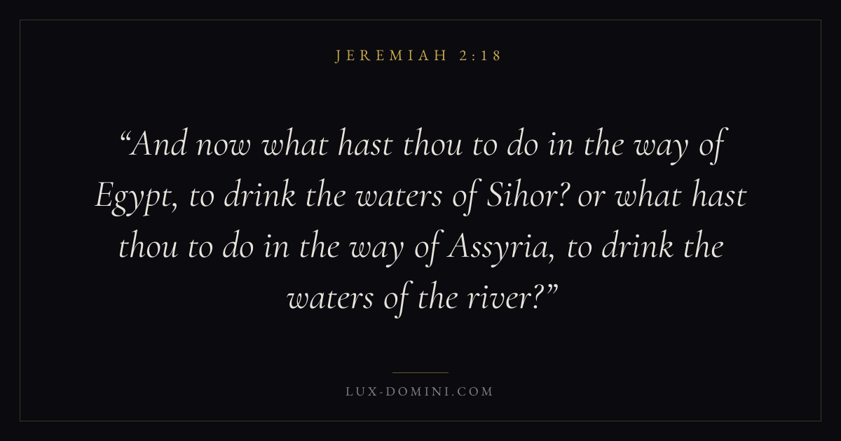 And now what hast thou to do in the way of Egypt, to drink the waters of Sihor? or what hast thou to do in the way of Assyria, to drink the waters of the river?