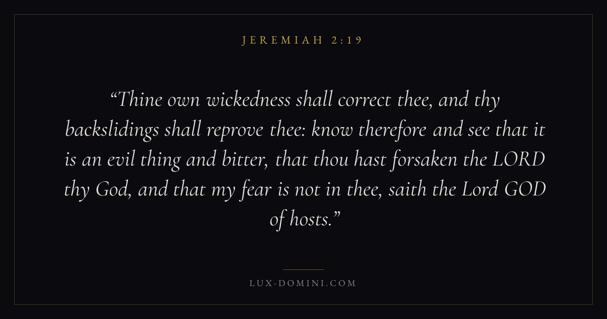 Thine own wickedness shall correct thee, and thy backslidings shall reprove thee: know therefore and see that it is an evil thing and bitter, that thou hast forsaken the LORD thy God, and that my fear is not in thee, saith the Lord GOD of hosts.
