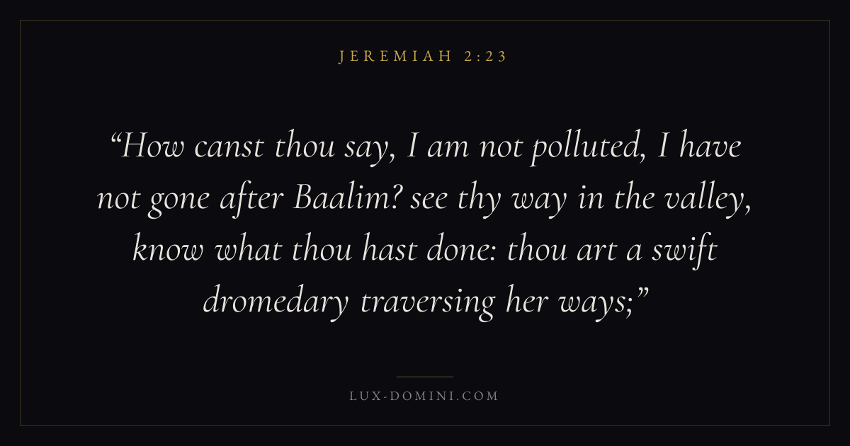 How canst thou say, I am not polluted, I have not gone after Baalim? see thy way in the valley, know what thou hast done: thou art a swift dromedary traversing her ways;