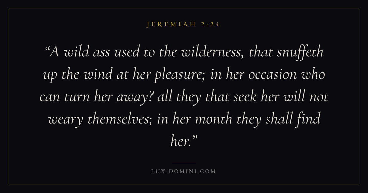 A wild ass used to the wilderness, that snuffeth up the wind at her pleasure; in her occasion who can turn her away? all they that seek her will not weary themselves; in her month they shall find her.