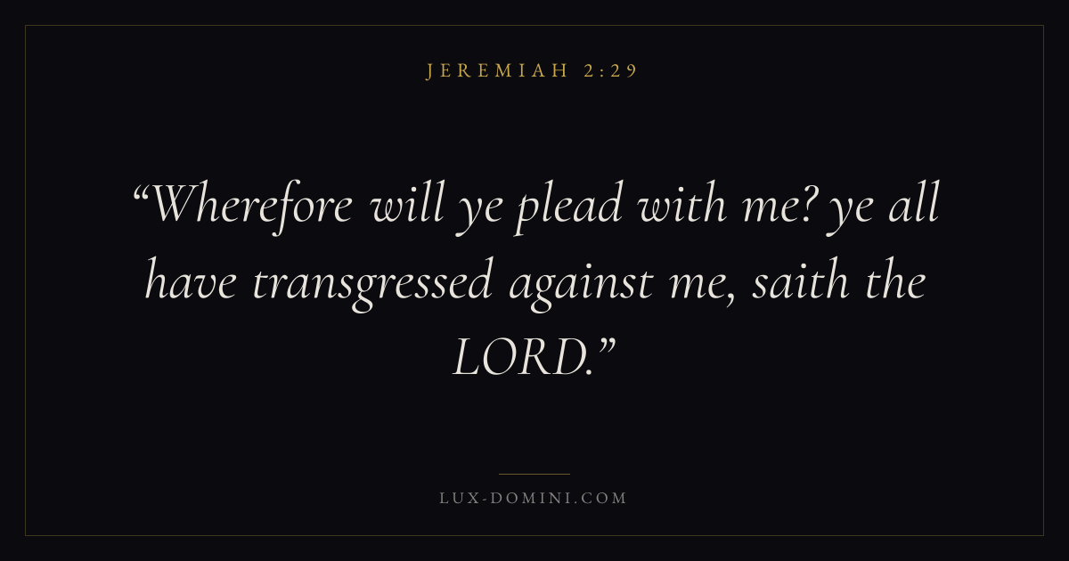 Books / Jeremiah / Chapter 2 / Verse 29 ← Jeremiah 2:28 Jeremiah 2:29 Jeremiah 2:30 → Wherefore will ye plead with me? ye all have transgressed against me, saith the LORD. Download verse card Share on Twitter Share on Facebook Pin it ✦ Key themes HopeSuffering and trialsJustice and mercyJudgment Read with Jeremiah 2:30Romans 8:24Revelation 21:4Romans 8:18 Related topics Bible verses about hopeBible verses about suffering and trialsBible verses about justice and mercy ✦ Jeremiah Chapter 2 verses V. 1 V. 2 V. 3 V. 4 V. 5 V. 6 V. 7 V. 8 V. 9 V. 10 V. 11 V. 12 V. 13 V. 14 V. 15 V. 16 V. 17 V. 18 V. 19 V. 20 V. 21 V. 22 V. 23 V. 24 V. 25 V. 26 V. 27 V. 28 V. 29 V. 30 V. 31 V. 32 V. 33 V. 34 V. 35 V. 36 V. 37