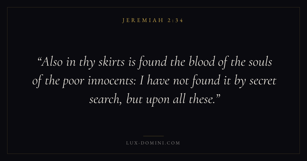 Also in thy skirts is found the blood of the souls of the poor innocents: I have not found it by secret search, but upon all these.