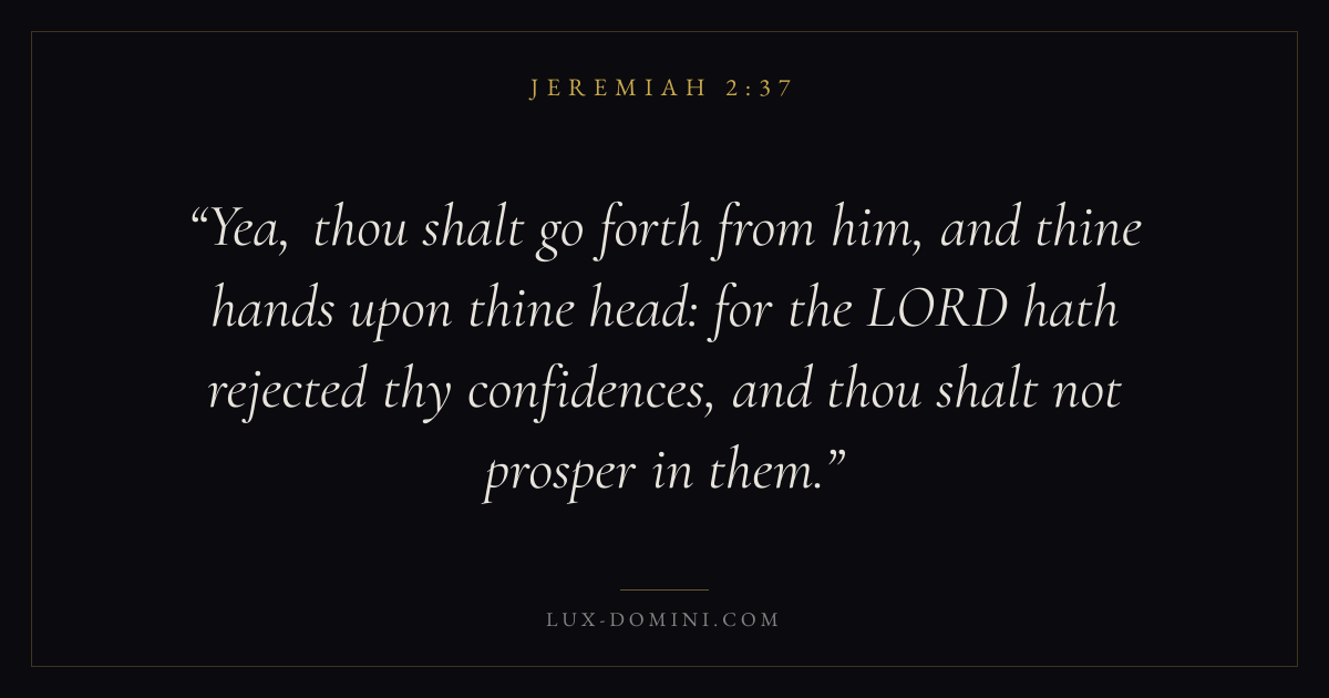 Yea, thou shalt go forth from him, and thine hands upon thine head: for the LORD hath rejected thy confidences, and thou shalt not prosper in them.