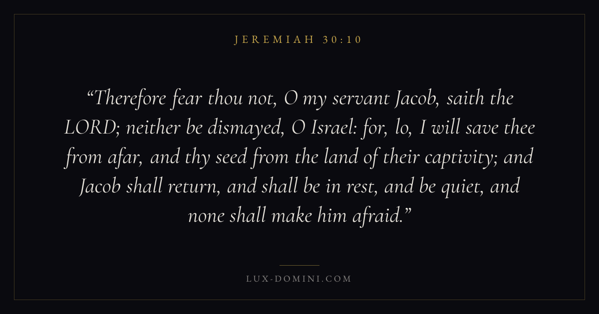 Therefore fear thou not, O my servant Jacob, saith the LORD; neither be dismayed, O Israel: for, lo, I will save thee from afar, and thy seed from the land of their captivity; and Jacob shall return, and shall be in rest, and be quiet, and none shall make him afraid.