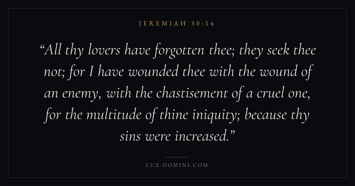 All thy lovers have forgotten thee; they seek thee not; for I have wounded thee with the wound of an enemy, with the chastisement of a cruel one, for the multitude of thine iniquity; because thy sins were increased.