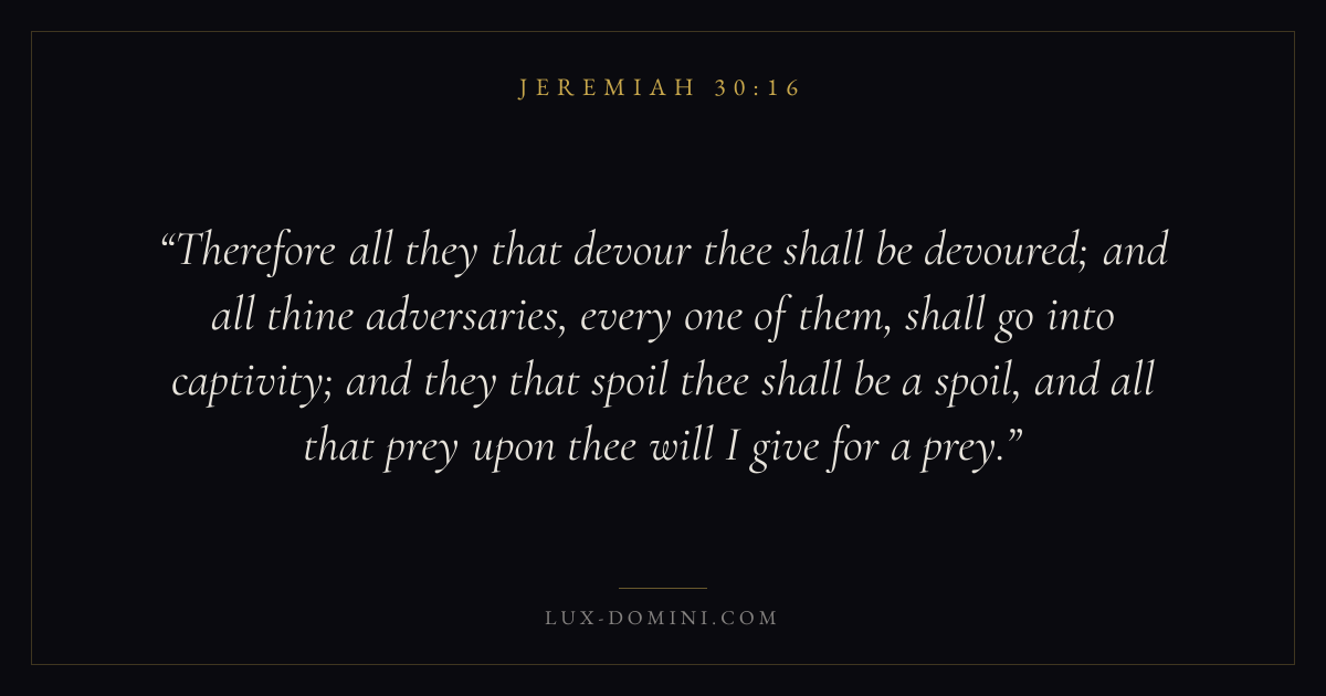 Therefore all they that devour thee shall be devoured; and all thine adversaries, every one of them, shall go into captivity; and they that spoil thee shall be a spoil, and all that prey upon thee will I give for a prey.