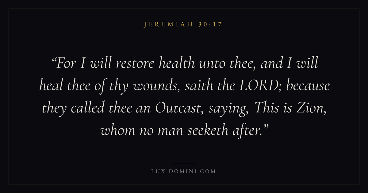 For I will restore health unto thee, and I will heal thee of thy wounds, saith the LORD; because they called thee an Outcast, saying, This is Zion, whom no man seeketh after.