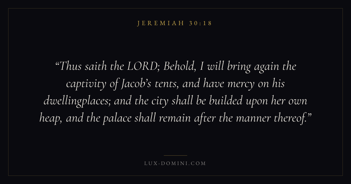 Thus saith the LORD; Behold, I will bring again the captivity of Jacob’s tents, and have mercy on his dwellingplaces; and the city shall be builded upon her own heap, and the palace shall remain after the manner thereof.
