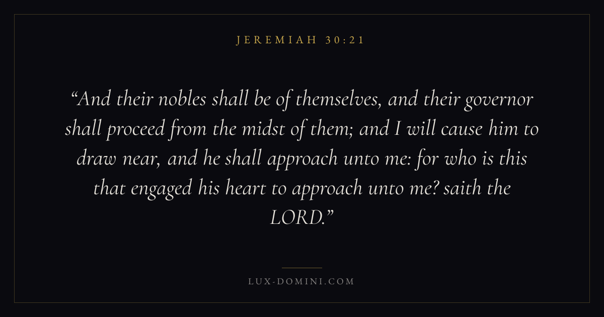 And their nobles shall be of themselves, and their governor shall proceed from the midst of them; and I will cause him to draw near, and he shall approach unto me: for who is this that engaged his heart to approach unto me? saith the LORD.