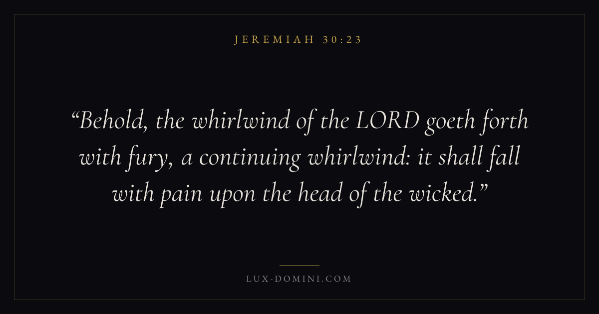 Behold, the whirlwind of the LORD goeth forth with fury, a continuing whirlwind: it shall fall with pain upon the head of the wicked.