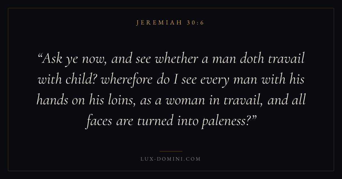 Ask ye now, and see whether a man doth travail with child? wherefore do I see every man with his hands on his loins, as a woman in travail, and all faces are turned into paleness?