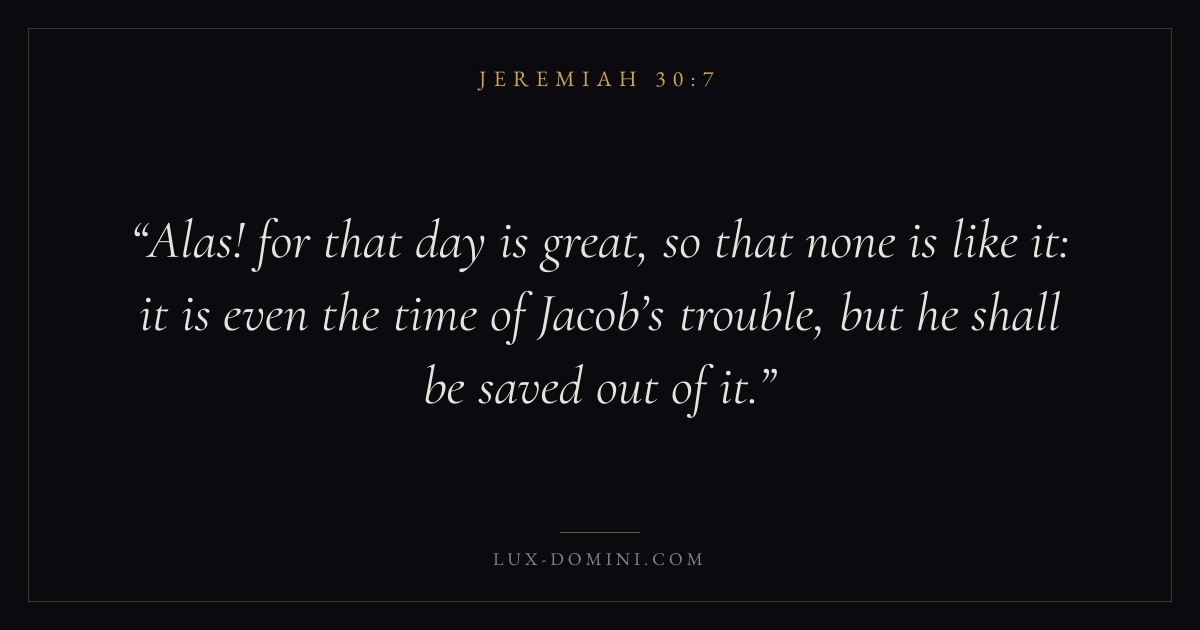 Alas! for that day is great, so that none is like it: it is even the time of Jacob’s trouble, but he shall be saved out of it.