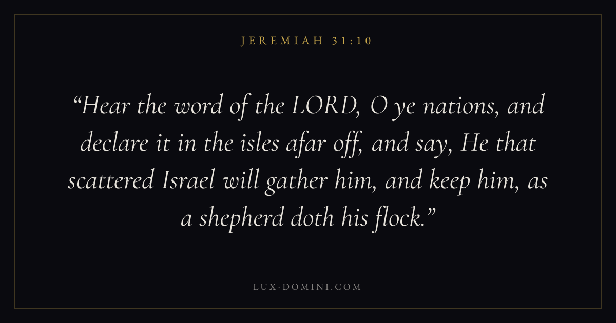 Hear the word of the LORD, O ye nations, and declare it in the isles afar off, and say, He that scattered Israel will gather him, and keep him, as a shepherd doth his flock.