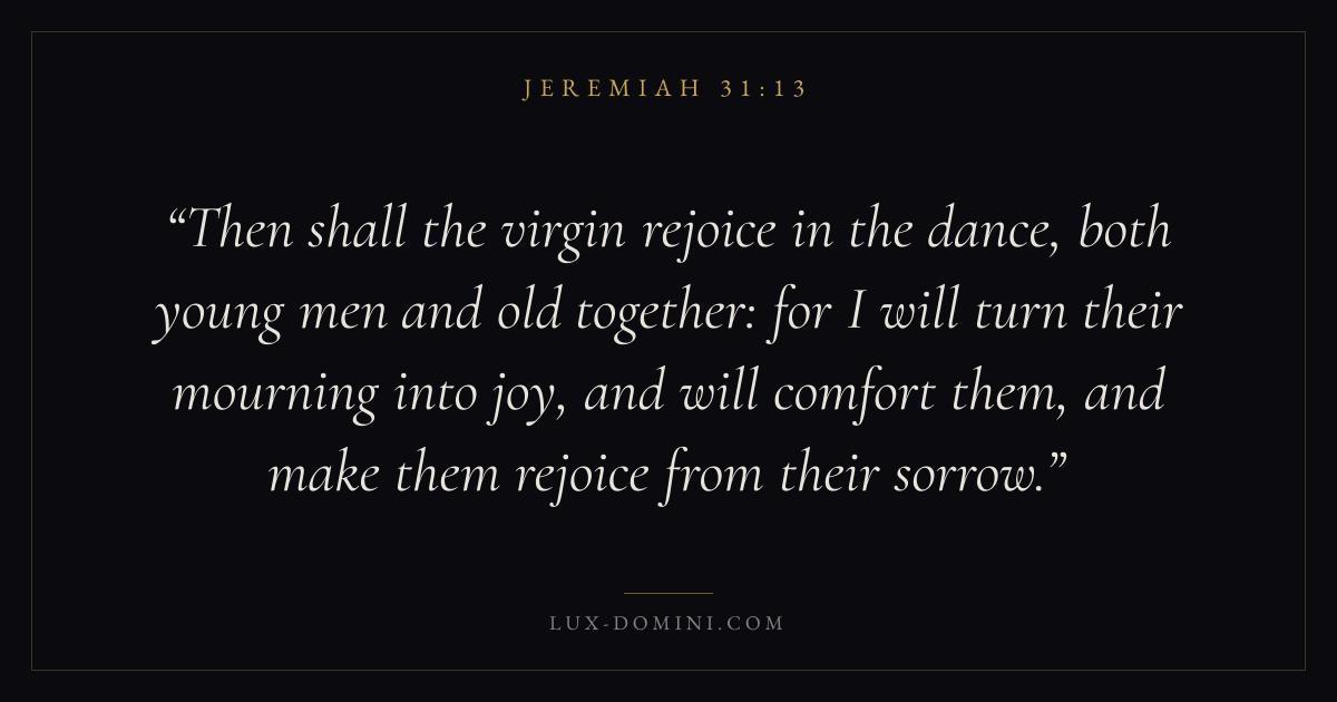 Then shall the virgin rejoice in the dance, both young men and old together: for I will turn their mourning into joy, and will comfort them, and make them rejoice from their sorrow.