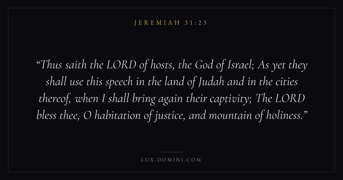 Thus saith the LORD of hosts, the God of Israel; As yet they shall use this speech in the land of Judah and in the cities thereof, when I shall bring again their captivity; The LORD bless thee, O habitation of justice, and mountain of holiness.