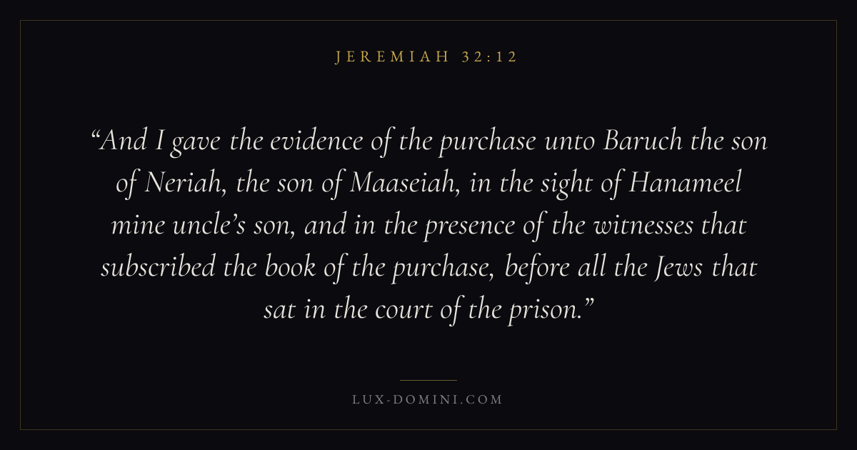 And I gave the evidence of the purchase unto Baruch the son of Neriah, the son of Maaseiah, in the sight of Hanameel mine uncle’s son, and in the presence of the witnesses that subscribed the book of the purchase, before all the Jews that sat in the court of the prison.