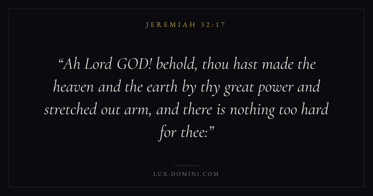 Ah Lord GOD! behold, thou hast made the heaven and the earth by thy great power and stretched out arm, and there is nothing too hard for thee: