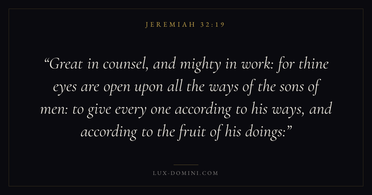 Great in counsel, and mighty in work: for thine eyes are open upon all the ways of the sons of men: to give every one according to his ways, and according to the fruit of his doings: