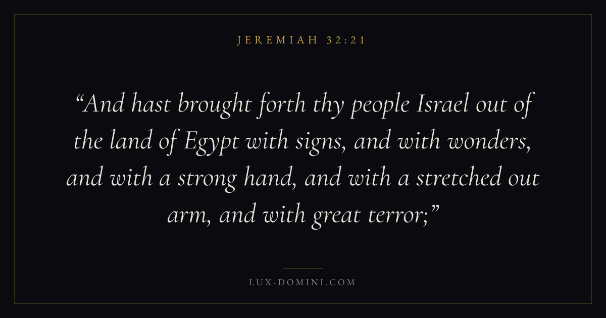 And hast brought forth thy people Israel out of the land of Egypt with signs, and with wonders, and with a strong hand, and with a stretched out arm, and with great terror;