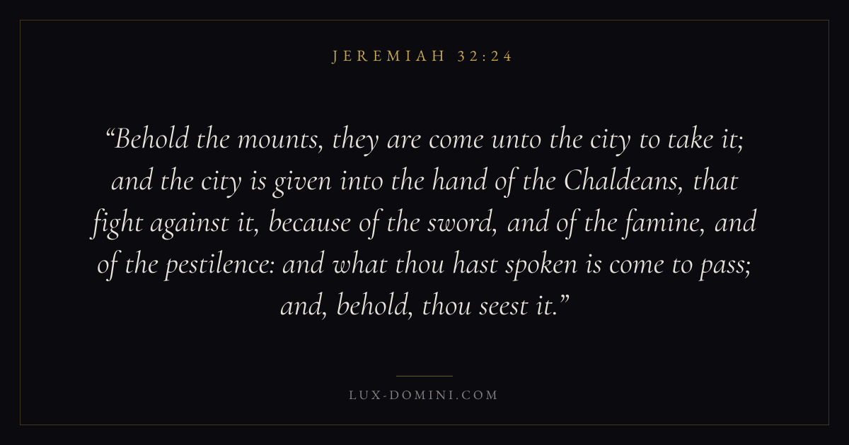 Behold the mounts, they are come unto the city to take it; and the city is given into the hand of the Chaldeans, that fight against it, because of the sword, and of the famine, and of the pestilence: and what thou hast spoken is come to pass; and, behold, thou seest it.