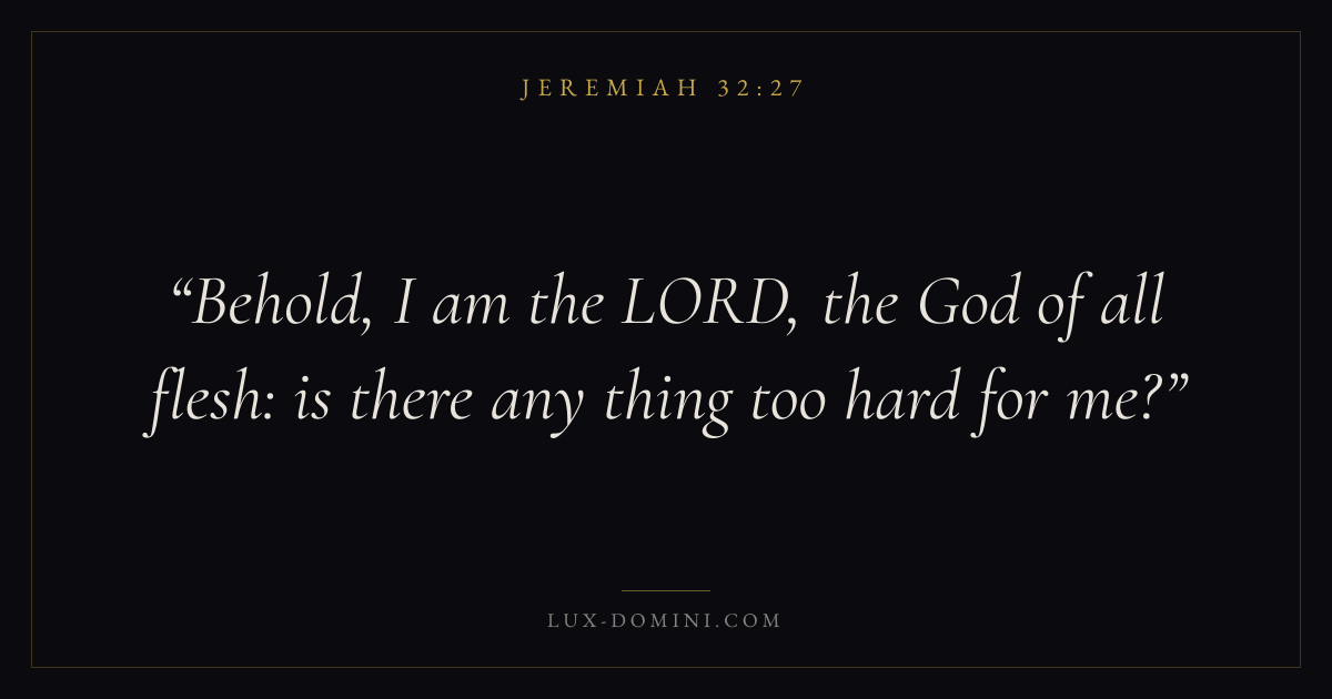 Books / Jeremiah / Chapter 32 / Verse 27 ← Jeremiah 32:26 Jeremiah 32:27 Jeremiah 32:28 → Behold, I am the LORD, the God of all flesh: is there any thing too hard for me? Download verse card Share on Twitter Share on Facebook Pin it ✦ Key themes HopeSuffering and trialsJustice and mercyGraceJudgment Read with Jeremiah 32:26Jeremiah 32:28Romans 8:24Revelation 21:4 Related topics Bible verses about hopeBible verses about suffering and trialsBible verses about justice and mercyBible verses about grace ✦ Jeremiah Chapter 32 verses V. 1 V. 2 V. 3 V. 4 V. 5 V. 6 V. 7 V. 8 V. 9 V. 10 V. 11 V. 12 V. 13 V. 14 V. 15 V. 16 V. 17 V. 18 V. 19 V. 20 V. 21 V. 22 V. 23 V. 24 V. 25 V. 26 V. 27 V. 28 V. 29 V. 30 V. 31 V. 32 V. 33 V. 34 V. 35 V. 36 V. 37 V. 38 V. 39 V. 40 V. 41 V. 42 V. 43 V. 44