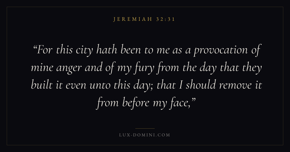 For this city hath been to me as a provocation of mine anger and of my fury from the day that they built it even unto this day; that I should remove it from before my face,