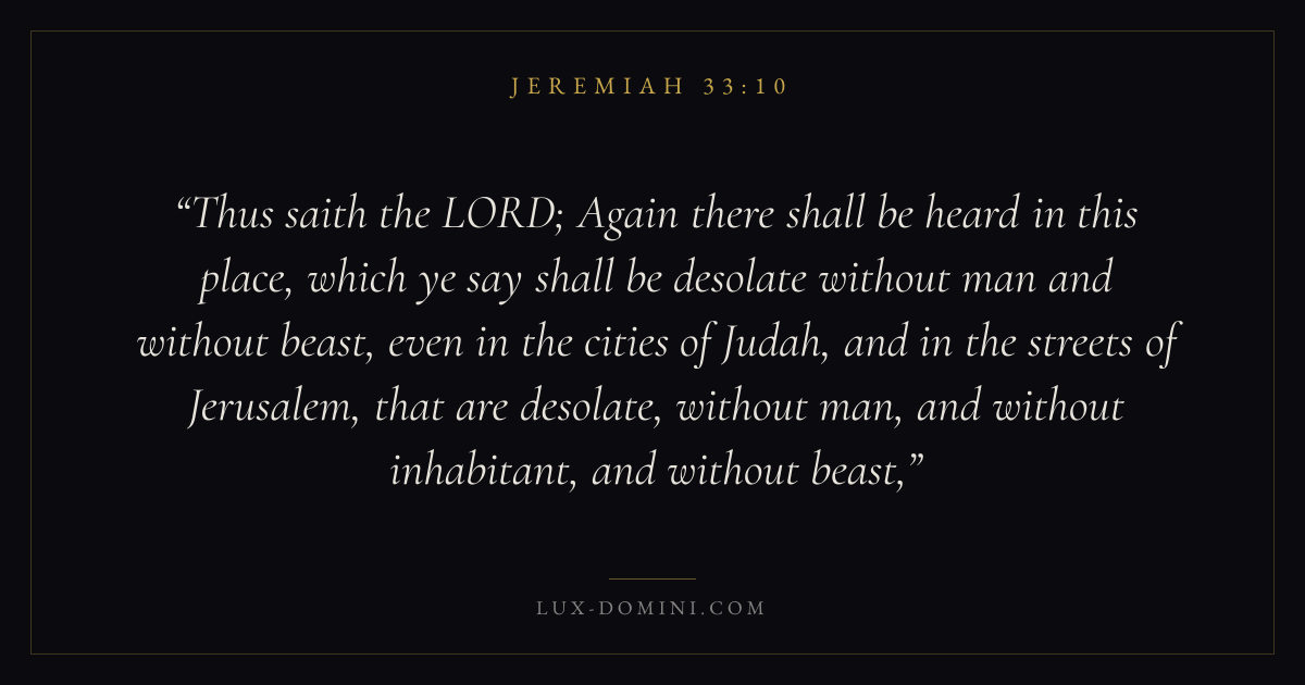 Thus saith the LORD; Again there shall be heard in this place, which ye say shall be desolate without man and without beast, even in the cities of Judah, and in the streets of Jerusalem, that are desolate, without man, and without inhabitant, and without beast,