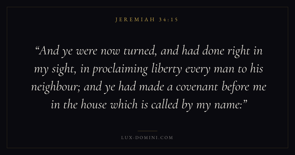 And ye were now turned, and had done right in my sight, in proclaiming liberty every man to his neighbour; and ye had made a covenant before me in the house which is called by my name: