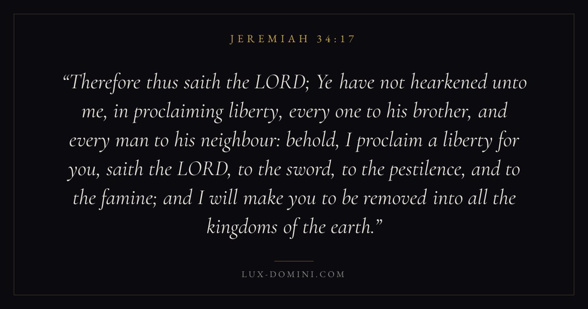Therefore thus saith the LORD; Ye have not hearkened unto me, in proclaiming liberty, every one to his brother, and every man to his neighbour: behold, I proclaim a liberty for you, saith the LORD, to the sword, to the pestilence, and to the famine; and I will make you to be removed into all the kingdoms of the earth.