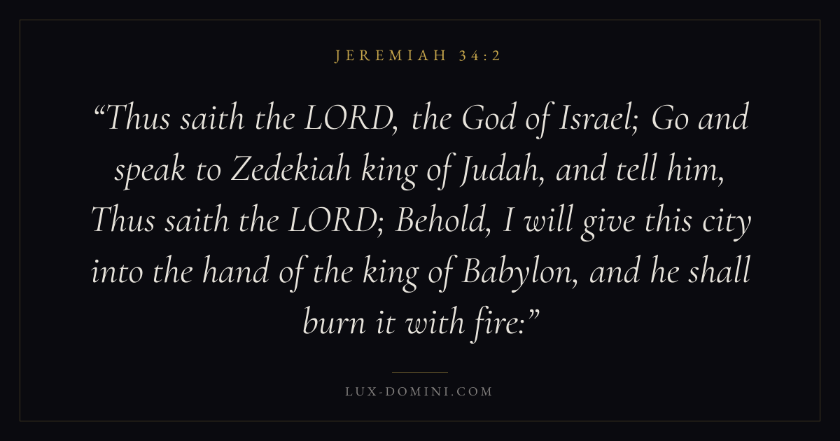 Thus saith the LORD, the God of Israel; Go and speak to Zedekiah king of Judah, and tell him, Thus saith the LORD; Behold, I will give this city into the hand of the king of Babylon, and he shall burn it with fire: