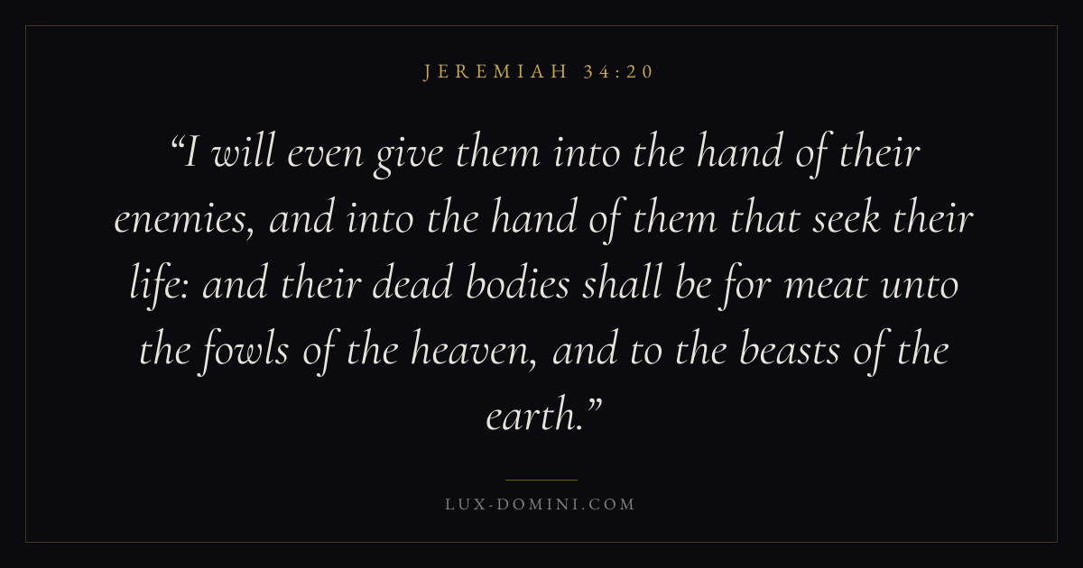 I will even give them into the hand of their enemies, and into the hand of them that seek their life: and their dead bodies shall be for meat unto the fowls of the heaven, and to the beasts of the earth.