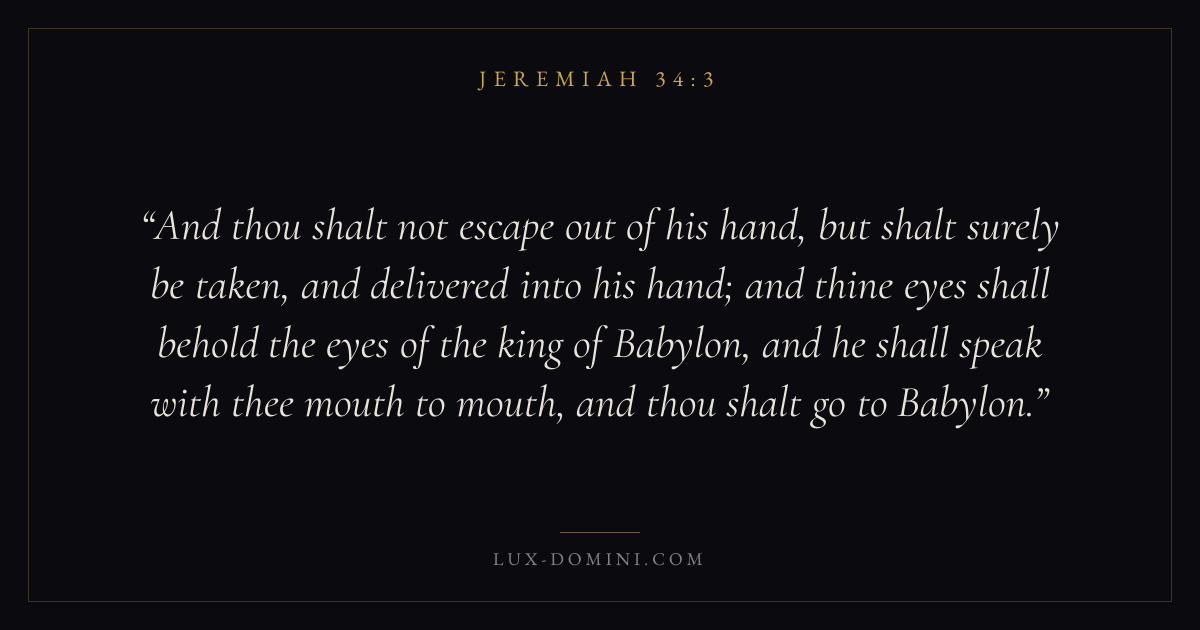 And thou shalt not escape out of his hand, but shalt surely be taken, and delivered into his hand; and thine eyes shall behold the eyes of the king of Babylon, and he shall speak with thee mouth to mouth, and thou shalt go to Babylon.