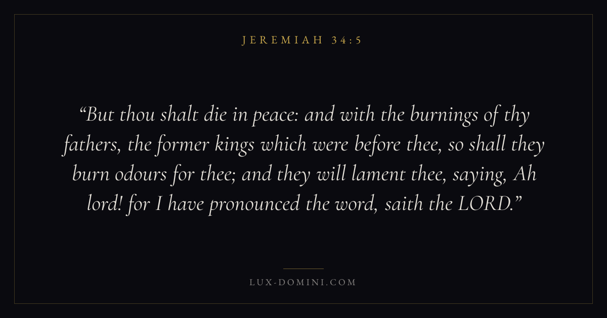 But thou shalt die in peace: and with the burnings of thy fathers, the former kings which were before thee, so shall they burn odours for thee; and they will lament thee, saying, Ah lord! for I have pronounced the word, saith the LORD.