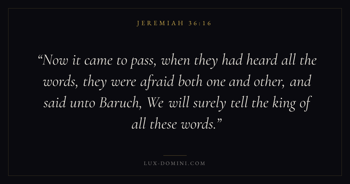 Now it came to pass, when they had heard all the words, they were afraid both one and other, and said unto Baruch, We will surely tell the king of all these words.