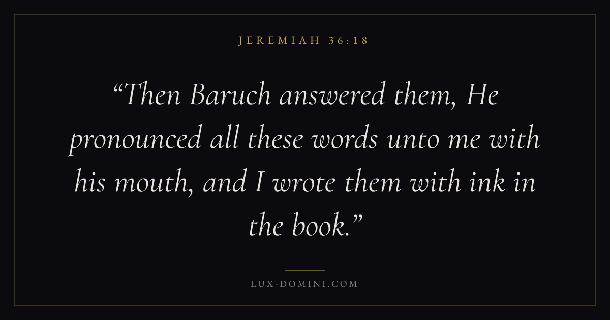 Then Baruch answered them, He pronounced all these words unto me with his mouth, and I wrote them with ink in the book.