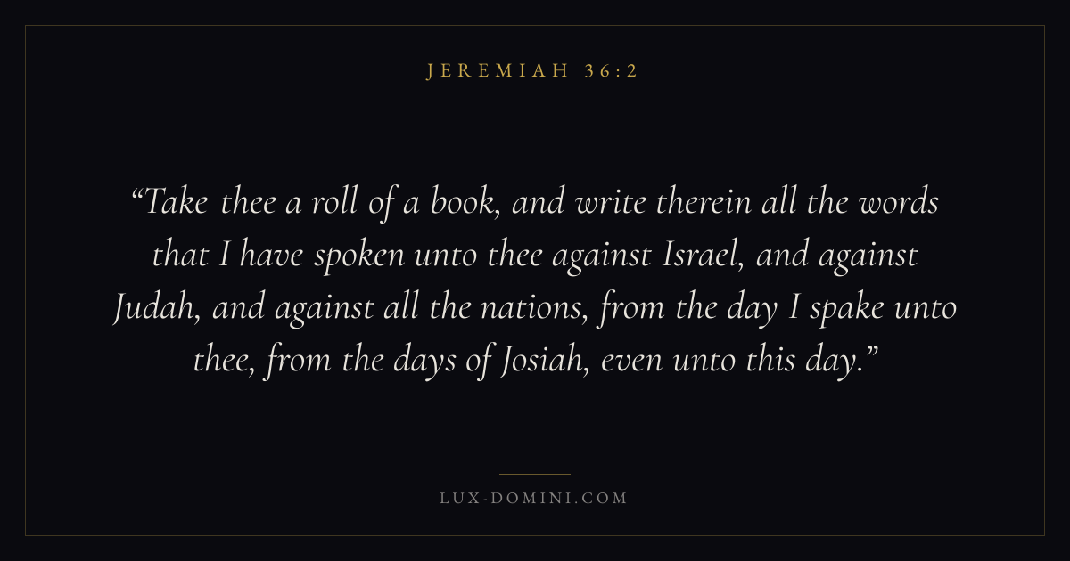 Take thee a roll of a book, and write therein all the words that I have spoken unto thee against Israel, and against Judah, and against all the nations, from the day I spake unto thee, from the days of Josiah, even unto this day.
